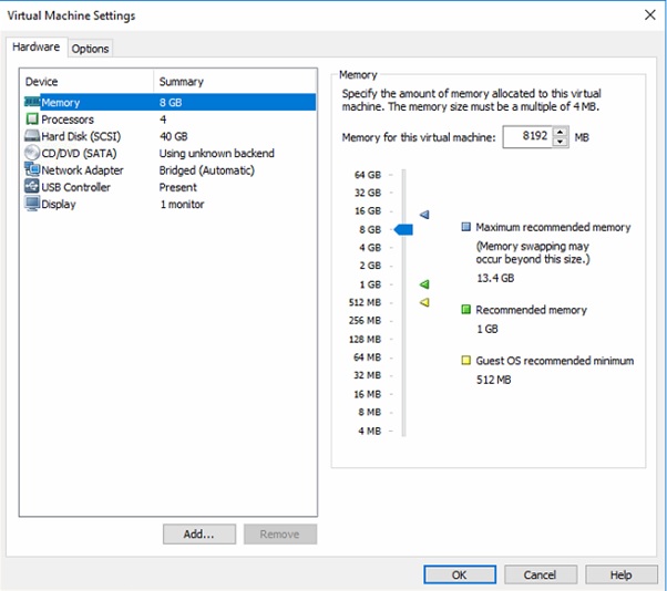 The VM settings will adjust according to your machine's specs. I just left the default settings of 8 GB RAM and 40 GB HD space.